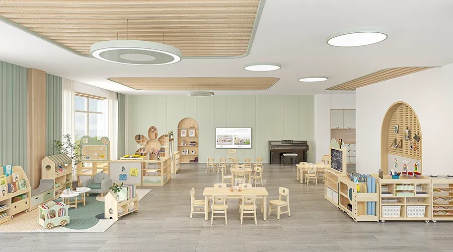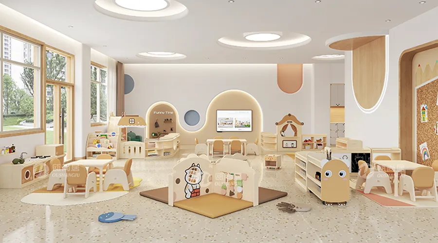 產品亮點:托育的孩子年齡較小,家具主要使用原木材質,簡單的紋理、細膩的手感、舒適的材質,營造出使孩子感到安心的氛圍。為避免出現五顏六色的視覺沖擊,整體以原木色為主色調,配以同色系的暖黃、暖橙、暖咖作為點綴色,旨在創造一個溫馨暖意的幼兒成長環境。