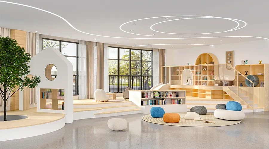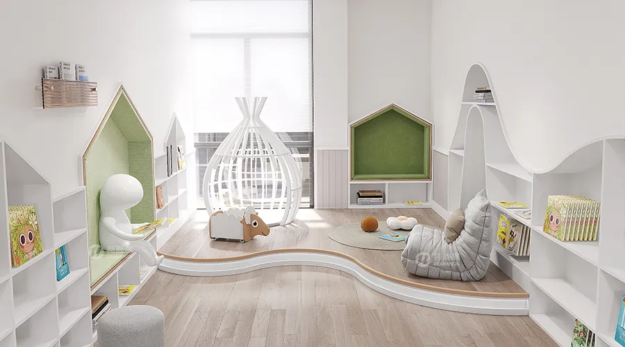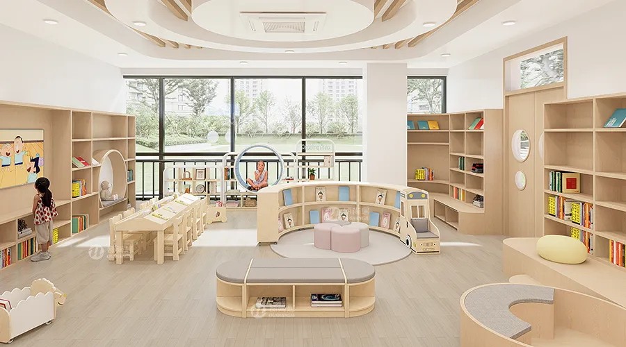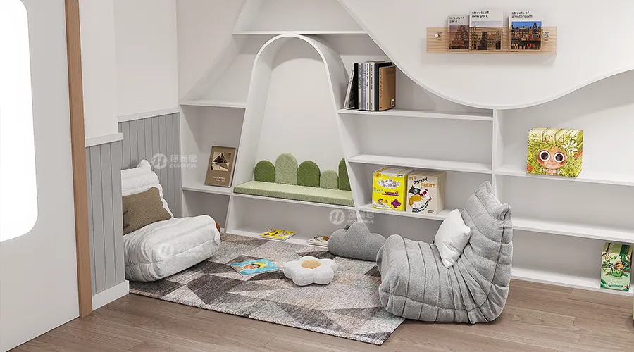 產品亮點:幼兒園閱讀室設計的核心理念是以孩子為中心,注重培養孩子的閱讀興趣和習慣。設置寬敞、舒適的閱讀座位區,如小型沙發、圓形閱讀桌等,運用溫暖的色彩,如淡黃、卡其色等,營造舒適、寧靜的閱讀氛圍。