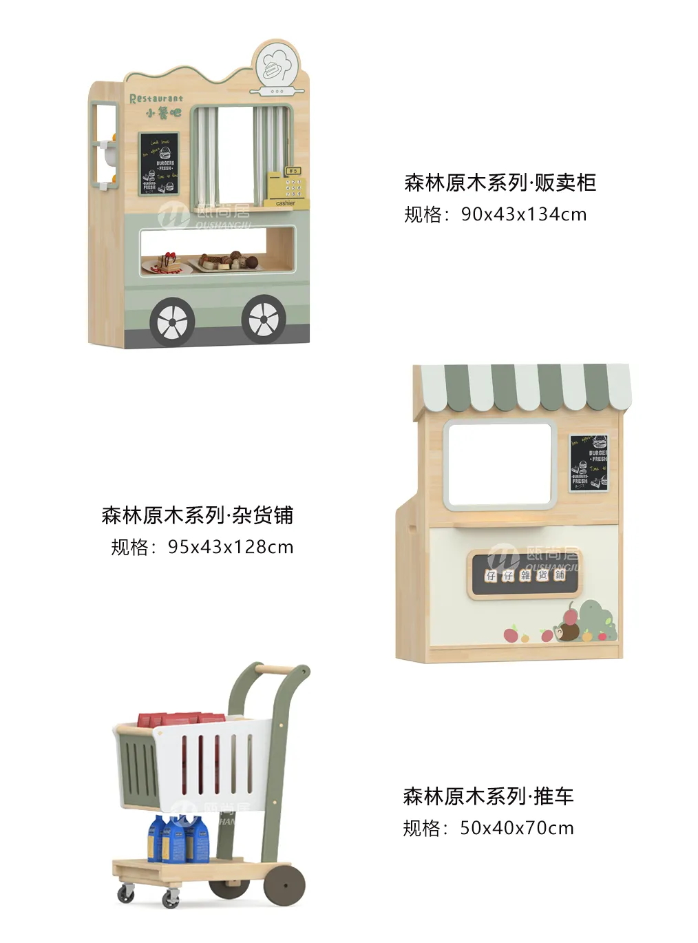 販賣(mài)小餐吧、雜貨鋪等貼近生活的場(chǎng)景,激發(fā)兒童的游戲興趣,培養(yǎng)兒童的合作意識(shí)和扮演能力。